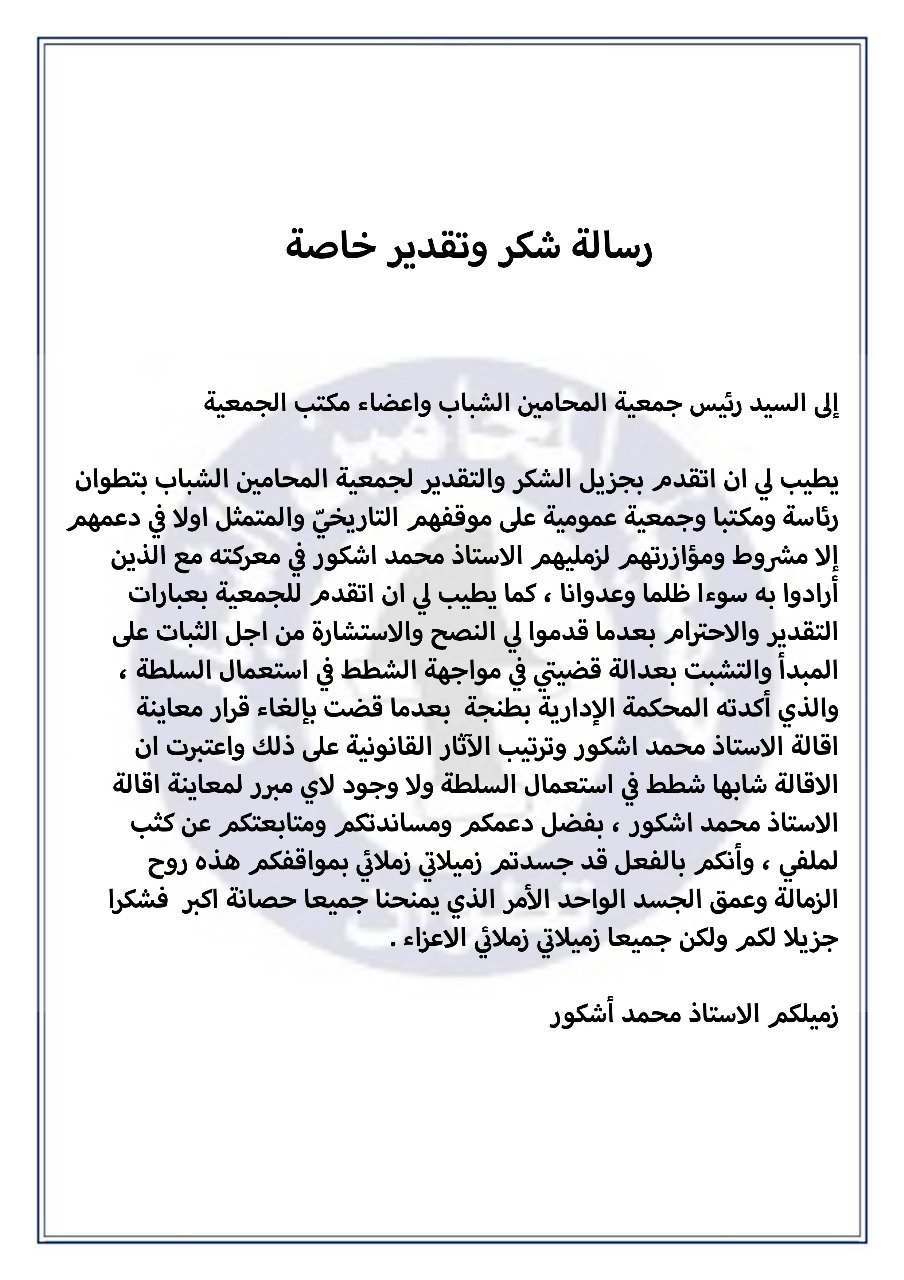 أتشرف بأن أتقدم بخالص عبارات الشكر والتقدير إلى جمعية المحامين الشباب بتطوان، رئاسةً ومكتبًا وجمعيةً عمومية، على موقفهم التاريخي والداعم اللامشروط لزميلهم الأستاذ محمد أشكور، في معركته ضد الظلم والتعسف الذي تعرض له.