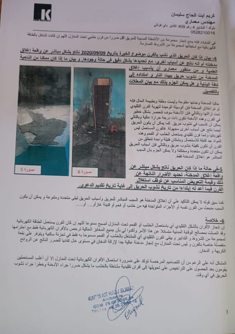 كما تم إنجاز عدة تقارير خبرات قضائية، بكون الفرن غير صالح للاستعمال ولايتوفر على الشروط الصحية للعمل، وأن الرخصة قديمة، ويجب تجديدها وفقا لشروط السلامة الصحية، وهذه الخبرات القضائية تم انجازها من طرف: