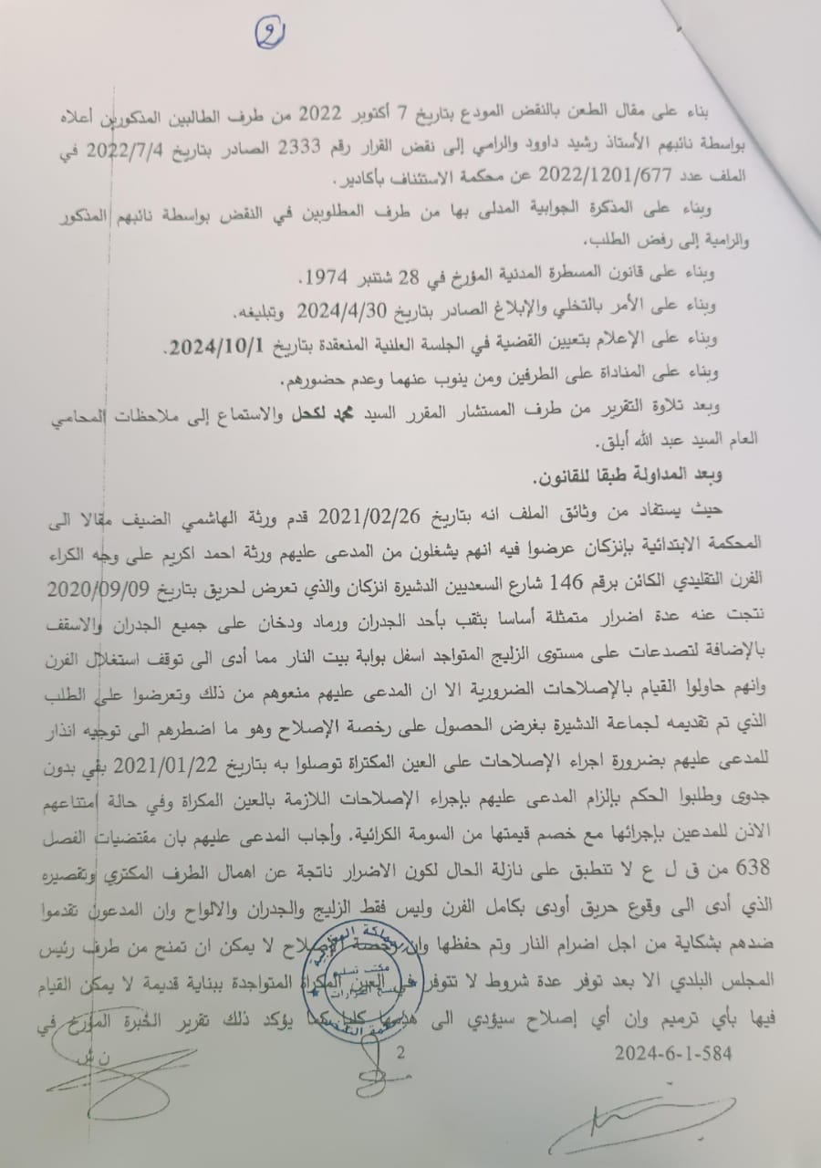 و القرار الاستئنافي الصادر من محكمة الاستئناف بأكادير حسب قرار رقم 2333 بتاريخ 4يوليوز 2023 في ملف رقم 677 |1201|2022.
