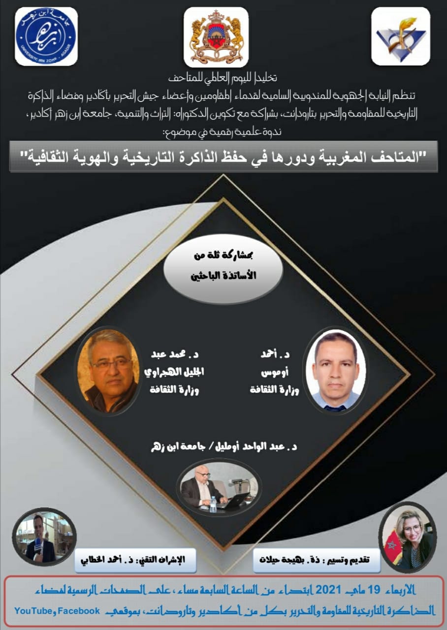 احتفالا باليوم العالمي للمتاحف برسم سنة 2021 نظمت النيابة الجهوية للمندوبية السامية لقدماء المقاومين وأعضاء جيش التحرير بأكادير وفضاء الذاكرة التاريخية للمقاومة والتحرير بتارودانت بشراكة مع تكوين الدكتوراه: التراث والتنمية بجامعة ابن زهر، ندوة علمية رقمية في موضوع “المتاحف المغربية ودورها في حفظ الذاكرة التاريخية والهوية الثقافية”. وذلك مساء يوم أمس 19 ماي 2021 وقد نشرت على الصفحات الرسمية لكل من فضاءات الذاكرة التاريخية للمقاومة والتحرير بكل من أكادير وتارودانت وصفحات المندوبية السامية لقدماء المقاومين وأعضاء جيش التحرير على موقعي Facebook و Youtube وذلك تماشيا مع الإجراءات الاحترازية لمكافحة كوفيد 19.