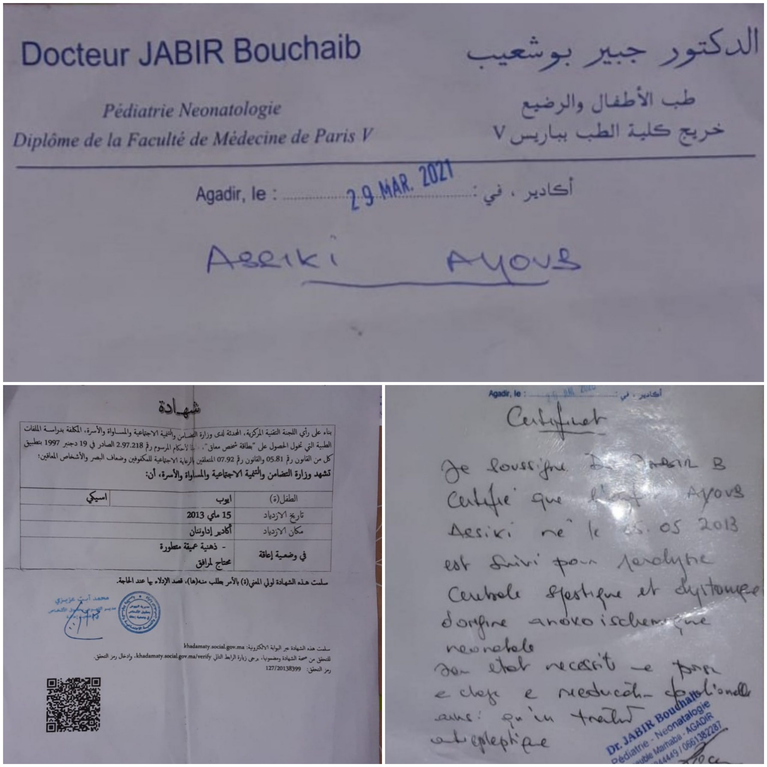 يخاطب أب الطفل أيوب أسيكِي القاطن بحي اكرإكنا بالقرب ن من المؤسسة الجديدة بجماعة اورير عمالة أكادير إدوتانان إلى أصحاب القلوب الرحيمة و أصحاب النوايا الحسبة و الضمائر الحية والله لتدمع العين ويحزن القلب عند رؤية هدا المنظر الدي لا تستطيع ان تتخيله لقريب او عزيز عليك لكنه ابتلاء من عند الله وكل من عند الله مرحبا به. فالطفل ايوب يعاني من اعاقة حركية من ولادته فحالته تدمع القلب والعين من كثرة الالم الدي يعانيه ناهيك عن حالته الصحية التي تزداد سوءا ، و كدلك حالته الاجتماعية.