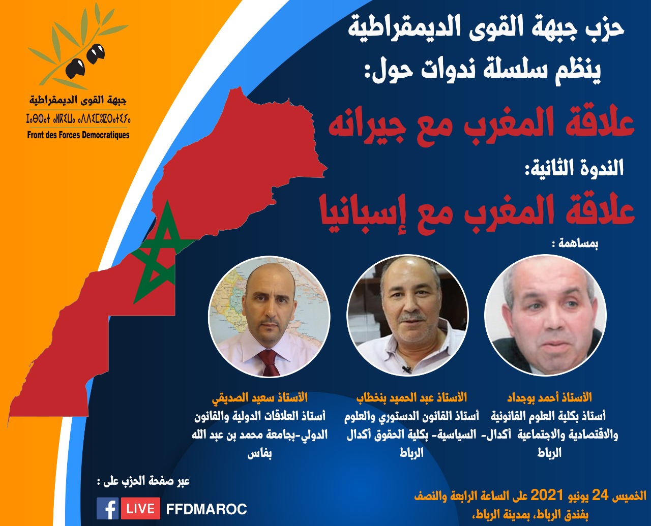 ينظم حزب جبهة القوى الديمقراطية ندوة في موضوع ” علاقة المغرب مع إسبانيا “، بمساهمة الأساتذة عبد الحميد بنخطاب، أحمد بوجداد وسعيد الصديقي، يوم الخميس 24 يونيو 2021، بقاعة الندوات، بفندق الرباط، بمدينة الرباط، ابتداء من الساعة الرابعة والنصف بعد الزوال (16h30).
