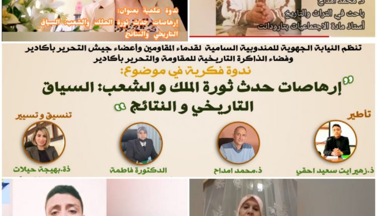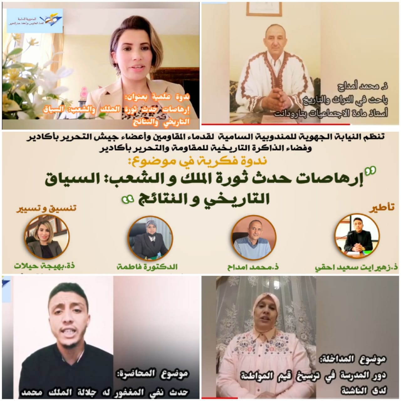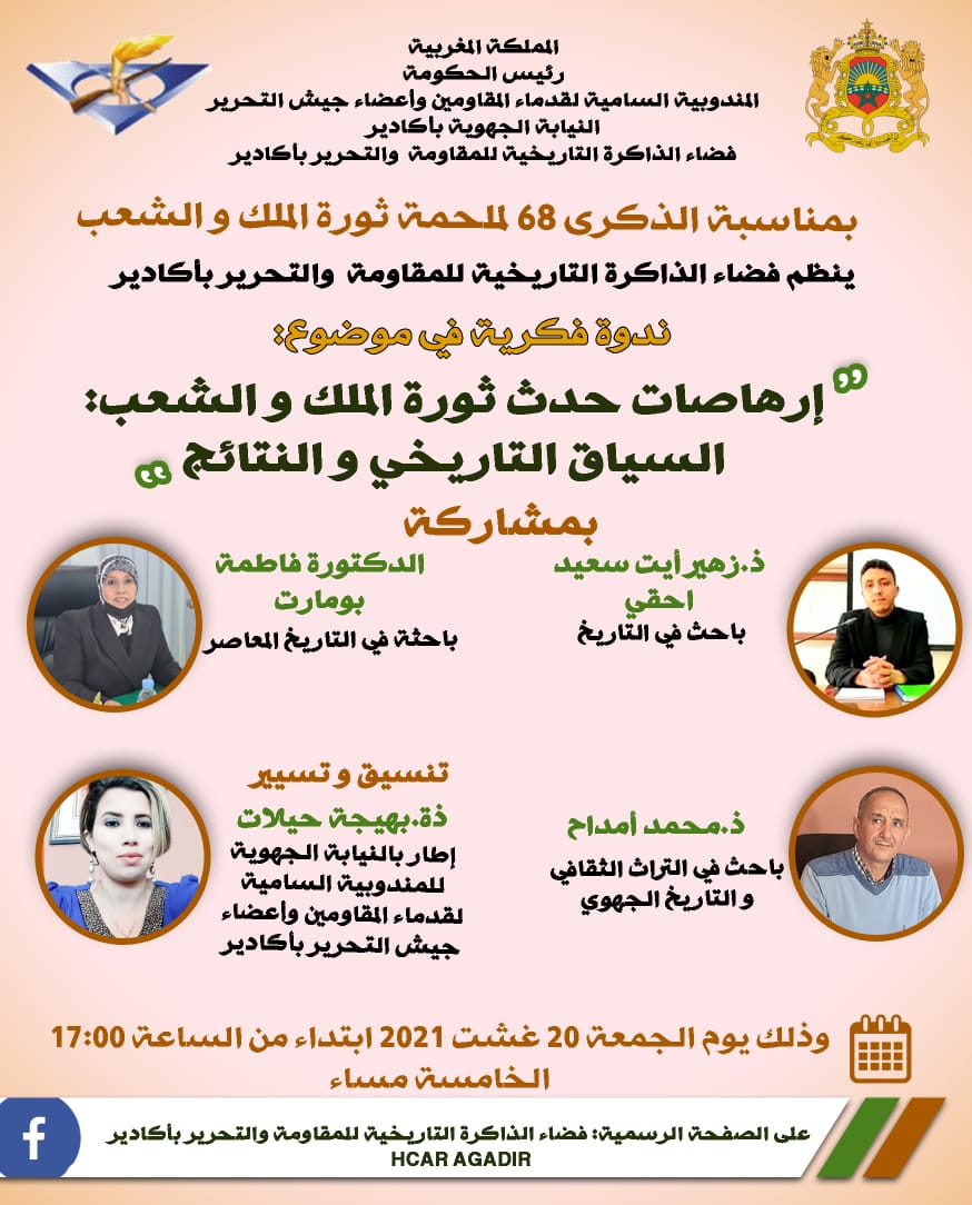 في إطار برنامجها الاحتفالي بالذكرى68 لثورة الملك والشعب الخالدة، نظمت النيابة الجهوية للمندوبية السامية لقدماء المقاومين وأعضاء جيش التحرير بجهة سوس ماسة وفضاء الذاكرة التاريخية للمقاومة والتحرير بأكادير ندوة فكرية عن بعد في موضوع: “إرهاصات حدث ثورة الملك والشعب السياق التاريخي والنتائج”، من تأطير نخبة من الأساتذة الباحثين من ذوي الاختصاص.