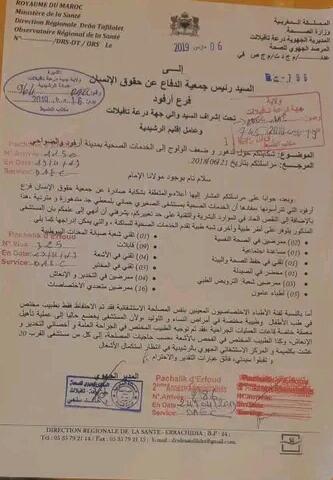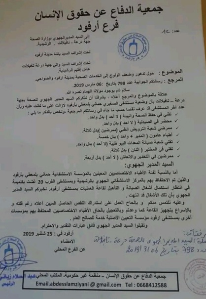 وحسب البلاغات نفسها لجمعية الدفاع عن حقوق الإنسان لفرع أرفود ، والذي طالب بإ رجاع الأطباء الذين تم تهريبهم من مستشفى أرفود إلى كلميمة المنتمية لنفس الإقليم (الرشيدية) ، مع الحفاظ على نظام المداومة بالمستشفى كما كان الحال عليه منذ سنتين أكد أن كل هذه الاختلالات أدت إلى غياب المساواة ،وتكافؤ فرص الاستفادة من الخدمات الصحية بين جماعات نفس الإقليم، لهذا طالب في بلاغه إلى تشجيع عملية التعاقد مع أطباء من أجل الاستجابة للانتظارات الملحة للمواطنين.كما طالب بإيفاد لجنة وزارية للكشف عن الخروقات التي يعرفها الوضع الصحي بالمدينة، مع تحميله المسؤولية للمسؤولين محليا وإقليميا وجهوا ووطنيا لما ستؤول إليه الأوضاع الصحية داخل المدينة، ومعلنا في نفس الوقت حقه في اتخاذ كافة الأشكال المشروعة لمواجهة كل الأخطار المحدقة بالقطاع الصحي بأرفود..