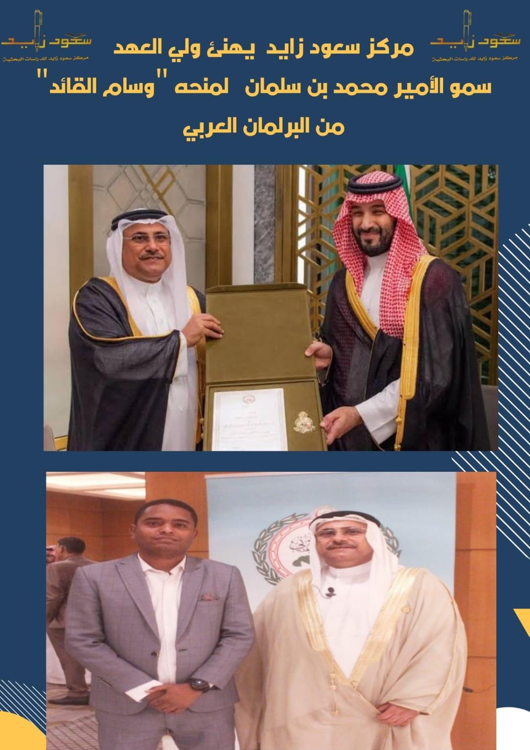 هنأ مركز سعود زايد ولي العهد سمو الأمير محمد بن سلمان لمنحه “وسام القائد” من البرلمان العربي حيث استقبل الأمير محمد بن سلمان بن عبدالعزيز آل سعود، ولي العهد رئيس مجلس الوزراء، في جدة ؛ رئيس البرلمان العربي عادل بن عبد الرحمن العسومي.