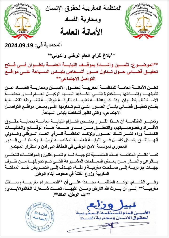 تعلن الأمانة العامة للمنظمة المغربية لحقوق الإنسان ومحاربة الفساد عن تثمينها وإشادتها بالخطوة التي اتخذها السيد الوكيل العام لدى محكمة الاستئناف بتطوان، وذلك بإعطائه تعليمات للفرقة الوطنية للشرطة القضائية بفتح تحقيق قضائي بشأن الصور التي تم تداولها على بعض مواقع التواصل الاجتماعي، والتي تظهر أشخاصًا بلباس السباحة.