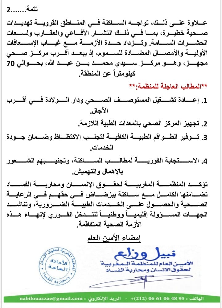 تؤكد المنظمة المغربية لحقوق الإنسان ومحاربة الفساد تضامنها الكامل مع ساكنة بيزضاض في حقهم في الرعاية الصحية والحصول على الخدمات الطبية الضرورية. وتناشد الجهات المسؤولة إقليمياً ووطنياً للتدخل الفوري لإنهاء هذه الأزمة الصحية المتفاقمة.