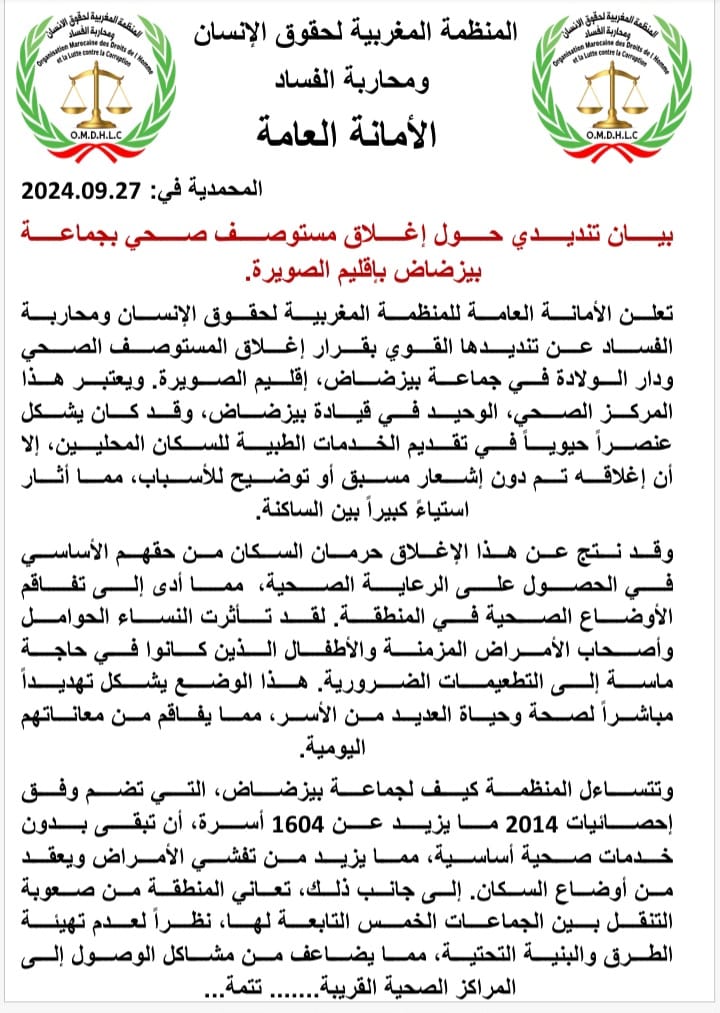تعلن الأمانة العامة للمنظمة المغربية لحقوق الإنسان ومحاربة الفساد عن تنديدها القوي بقرار إغلاق المستوصف الصحي ودار الولادة في جماعة بيزضاض، إقليم الصويرة. ويعتبر هذا المركز الصحي، الوحيد في قيادة بيزضاض، وقد كان يشكل عنصراً حيوياً في تقديم الخدمات الطبية للسكان المحليين. إلا أن إغلاقه تم دون إشعار مسبق أو توضيح للأسباب، مما أثار استياءً كبيراً بين الساكنة.