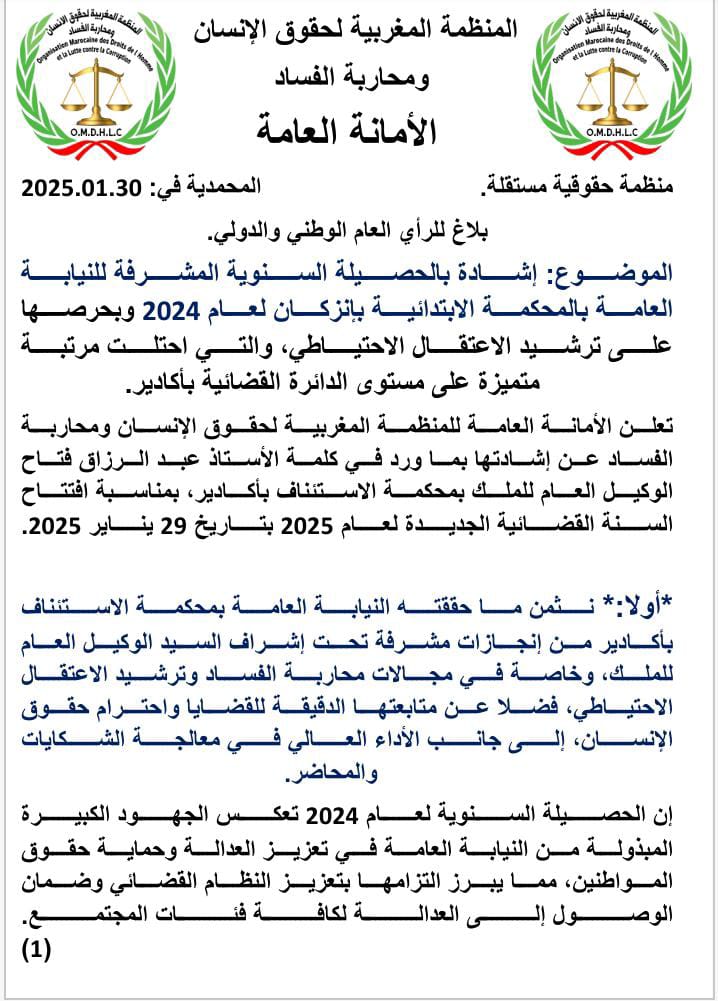 تعلن الأمانة العامة للمنظمة المغربية لحقوق الإنسان ومحاربة الفساد عن إشادتها بما ورد في كلمة الأستاذ عبد الرزاق فتاح، الوكيل العام للملك بمحكمة الاستئناف بأكادير، بمناسبة افتتاح السنة القضائية الجديدة لعام 2025 بتاريخ 29 يناير 2025.