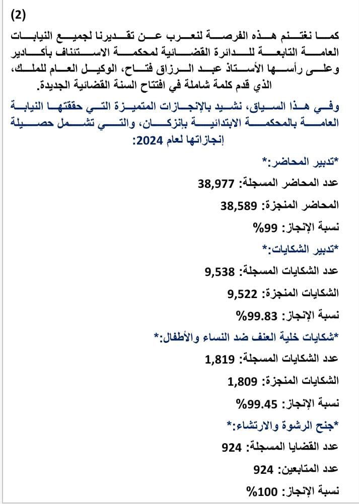 *وفي هذا السياق، نشيد بالإنجازات المتميزة التي حققتها النيابة العامة بالمحكمة الابتدائية بإنزكان*، والتي تشمل حصيلة إنجازاتها لعام 2024: