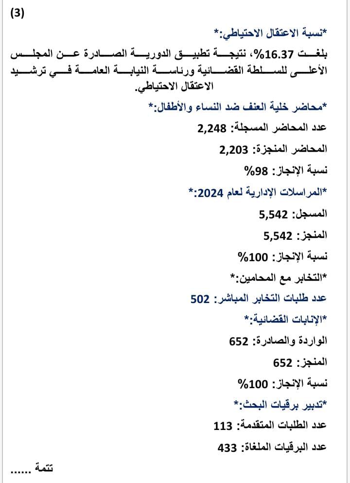 إن الحصيلة السنوية لعام 2024 تعكس الجهود الكبيرة المبذولة من النيابة العامة في تعزيز العدالة وحماية حقوق المواطنين، مما يبرز التزامها بتعزيز النظام القضائي وضمان الوصول إلى العدالة لكافة فئات المجتمع.