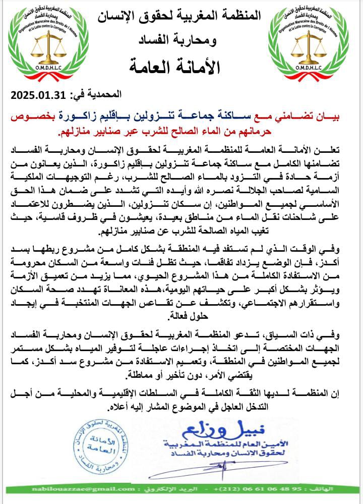 تعلن الأمانة العامة للمنظمة المغربية لحقوق الإنسان ومحاربة الفساد تضامنها الكامل مع ساكنة جماعة تنزولين بإقليم زاكورة، الذين يعانون من أزمة حادة في التزود بالماء الصالح للشرب، رغم التوجيهات الملكية السامية لصاحب الجلالة نصره الله وأيده التي تشدد على ضمان هذا الحق الأساسي لجميع المواطنين.