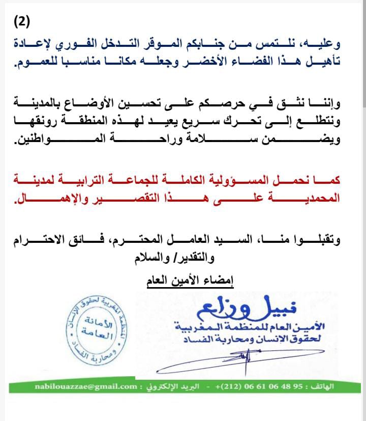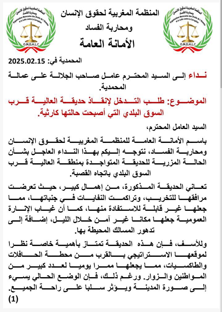 باسم الأمانة العامة للمنظمة المغربية لحقوق الإنسان ومحاربة الفساد، نتوجه إليكم بهذا النداء العاجل بشأن الحالة المزرية للحديقة المتواجدة بمنطقة العالية قرب السوق البلدي باتجاه القصبة.