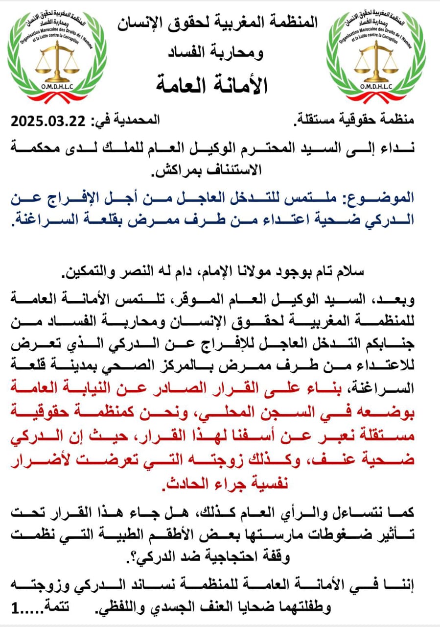 وبعد، السيد الوكيل العام الموقر، تلتمس الأمانة العامة للمنظمة المغربية لحقوق الإنسان ومحاربة الفساد من جنابكم التدخل العاجل للإفراج عن الدركي الذي تعرض للاعتداء من طرف ممرض بالمركز الصحي بمدينة قلعة السراغنة، بناء على القرار الصادر عن النيابة العامة بوضعه في السجن المحلي، ونحن كمنظمة حقوقية مستقلة نعبر عن أسفنا لهذا القرار، حيث إن الدركي ضحية عنف، وكذلك زوجته التي تعرضت لأضرار نفسية جراء الحادث.