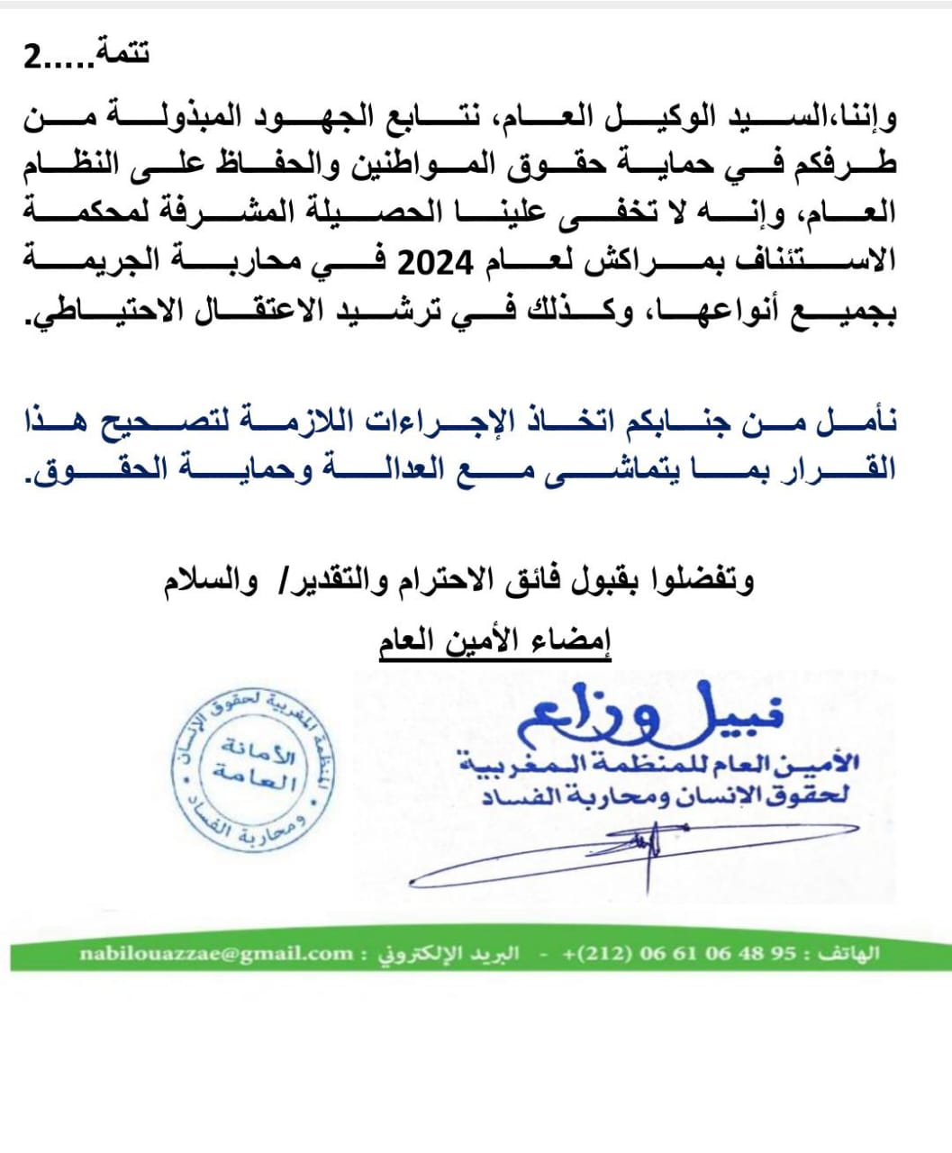 إمضاء نبيل وزاع الأمين العام للمنظمة المغربية لحقوق الإنسان ومحاربة الفساد.