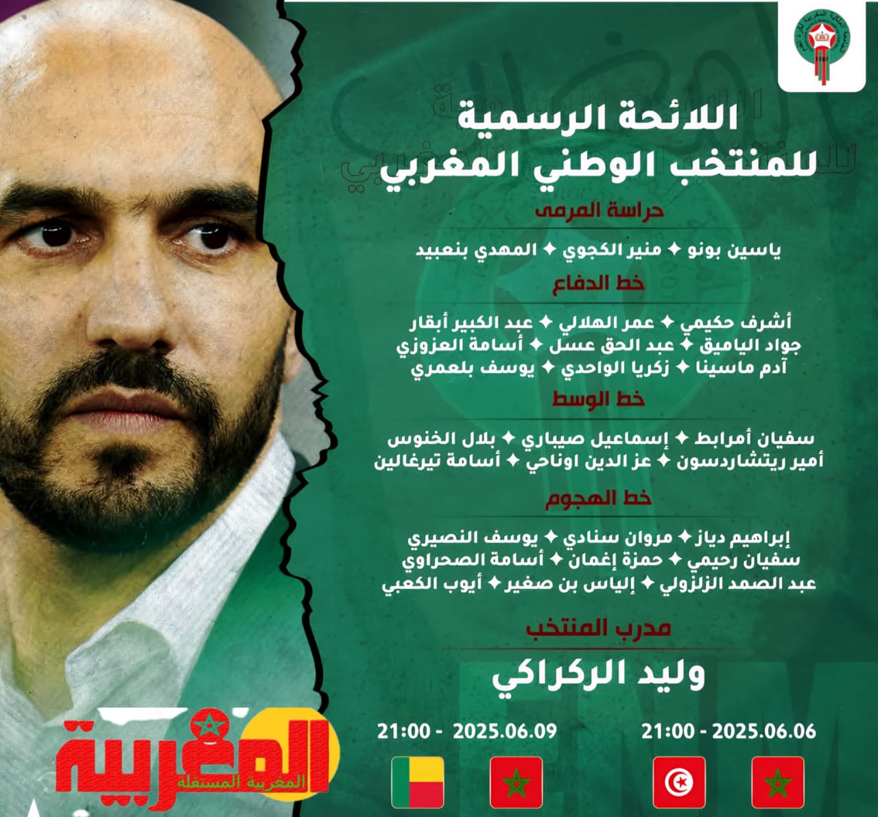في مؤتمر صحفي عقده الناخب الوطني وليد الركراكي اليوم كشف عن لائحة المنتخب المغربي المستدعاة لمبارتي تونس والبنين الوديتين