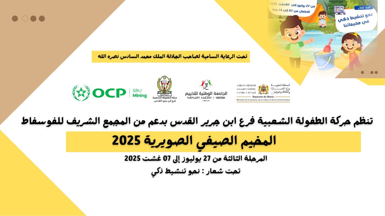 تحت الرئاسة السامية لصاحب الجلالة الملك محمد السادس نصره الله ، و في إطار سياسته الاجتماعية وتنزيلاً لبرنامجه التربوي والترفيهي لفائدة أطفال العالم القروي، وانخراطاً في الاستراتيجيات العمومية الموجهة لفئة الطفولة، يعلن المجمع الشريف للفوسفاط (OCP) وبرنامج Act4community بالشراكة مع الجمعيات المحلية تحت إشراف وزارة الشباب والثقافة والتواصل (قطاع الشباب) والجامعة الوطنية للتخييم عن إطلاق برنامجه لتعزيز أنشطة التخييم وتطوير خدماتها وضمان استمراريتها من خلال المساهمة في تنظيم المخيمات الصيفية – موسم 2025 تحت شعار “المخيمات التربوية فضاء للتميز وبناء الأجيال” ، والتي سيستفيد منها مجاناً حوالي 1200 من الأطفال من مختلف الفئات العمرية (بين 7 و15 سنة) المنحدرين حصراً من المناطق القروية تعزيزاً لسياسة القرب. مع الانفتاح على فئة ذوي الاحتياجات الخاصة، بمختلف فضاءات ومراكز التخييم الوطنية.