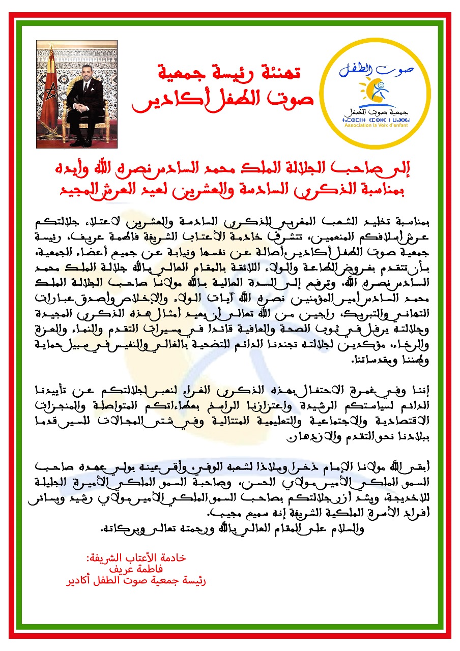 تهنئة من رئيسة جمعية صوت الطفل بأكادير موجهة إلى صاحب الجلالة الملك محمد السادس نصره الله وأيده بمناسبة الذكرى 26 لعيد العرش المجيد