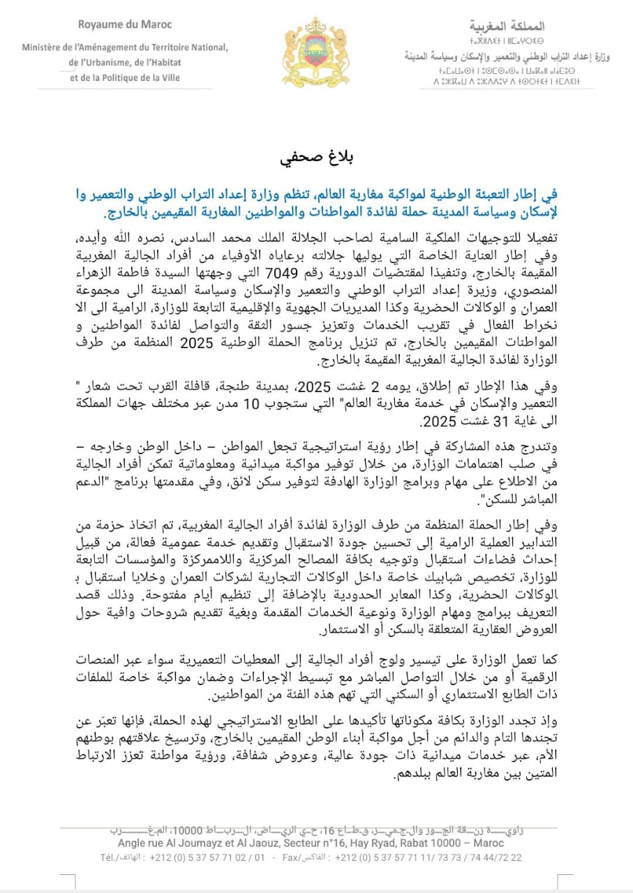 وزارة إعداد التراب الوطني والتعمير والإسكان وسياسة المدينة تنظم حملة لفائدة المواطنات والمواطنين المغاربة المقيمين بالخارج