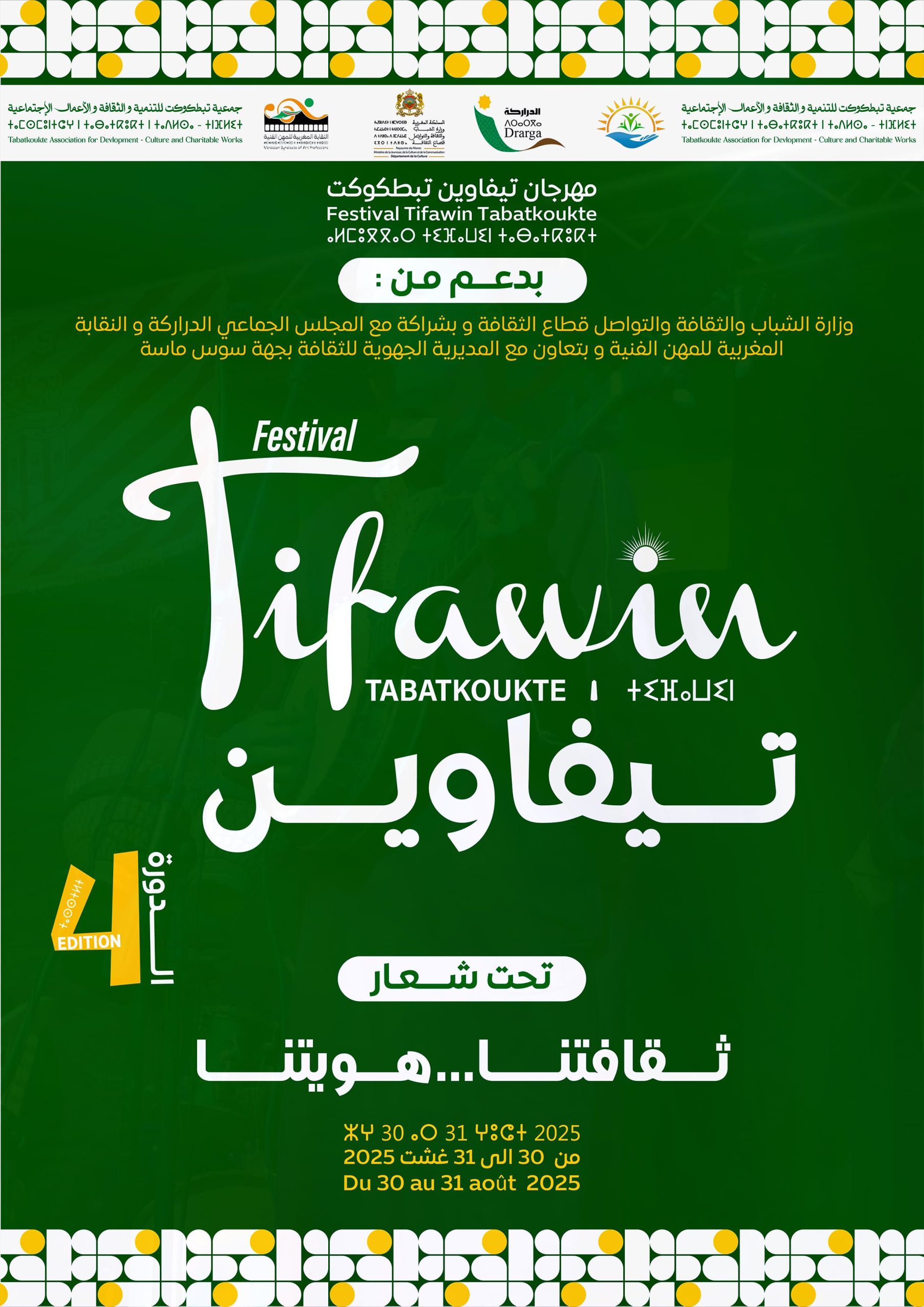بفضل دعم وزارة الشباب والثقافة والتواصل، قطاع الثقافة، وبشراكة مع المجلس الجماعي الدراركة والنقابة المغربية للمهن الفنية، وبتعاون مع المديرية الجهوية للثقافة بجهة سوس ماسة، يسرنا الإعلان عن انطلاق الدورة الرابعة من مهرجان تيفاوين تبطكوكت.