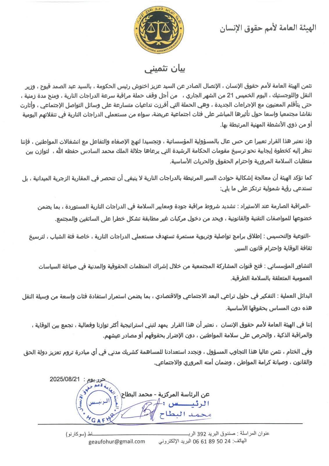 تثمن الهيئة العامة لأمم حقوق الإنسان ، الإتصال الصادر عن السيد عزيز اخنوش رئيس الحكومة ، بالسيد عبد الصمد قيوح ، وزير النقل واللوجستيك ، يومه الخميس 21 من الشهر الجاري ، من أجل وقف حملة مراقبة سرعة الدراجات النارية ، ومنح مدة زمنية ، حتى يتأقلم المعنيون مع الإجراءات الجديدة ، وهي الحملة التي أفرزت تداعيات متسارعة على وسائل التواصل الإجتماعي ، وأثارت نقاشا مجتمعيا واسعا حول تأثيرها المباشر على فئات اجتماعية عريضة، سواء من مستعملي الدراجات النارية في تنقلاتهم اليومية أو من ذوي الأنشطة المهنية المرتبطة بها.