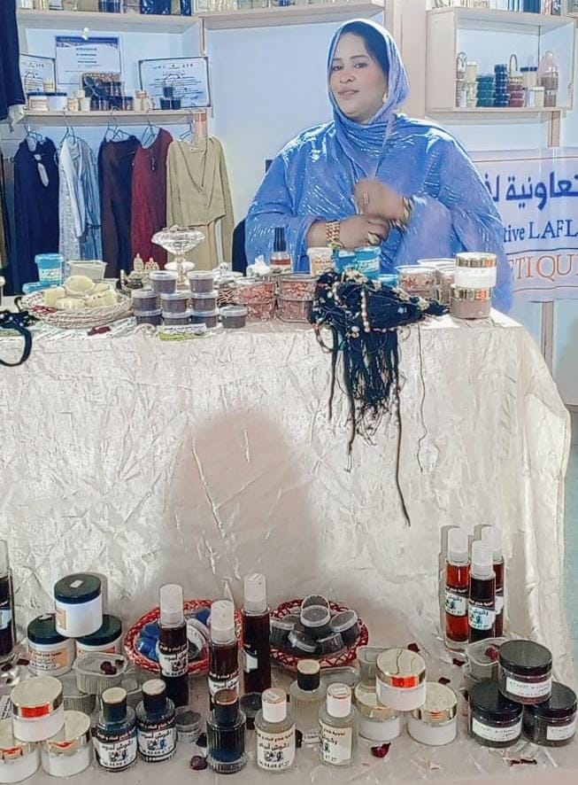 ومن بين التعاونيات التي لفتت انتباه الزوار، تعاونية شعاع الحناء والإبداع، التي قدمت نموذجًا مبتكرًا في إبراز العرس الصحراوي بكل طقوسه ومكوناته، بدءًا من نقش الحناء وتزيين العرائس بالمواد الطبيعية الخالصة، وصولًا إلى وضع الظفائر والحلي والمجوهرات الثمينة المصنوعة من العقيق الحر واللوبان الحر. كما عرضت التعاونية منتجات أخرى تشمل صناعة البخور والعطور والمواد التجميلية الطبيعية، إضافة إلى اعتمادها على أعشاب طبية محلية تستعمل في الطب البديل لعلاج بعض الأمراض والتجميل.