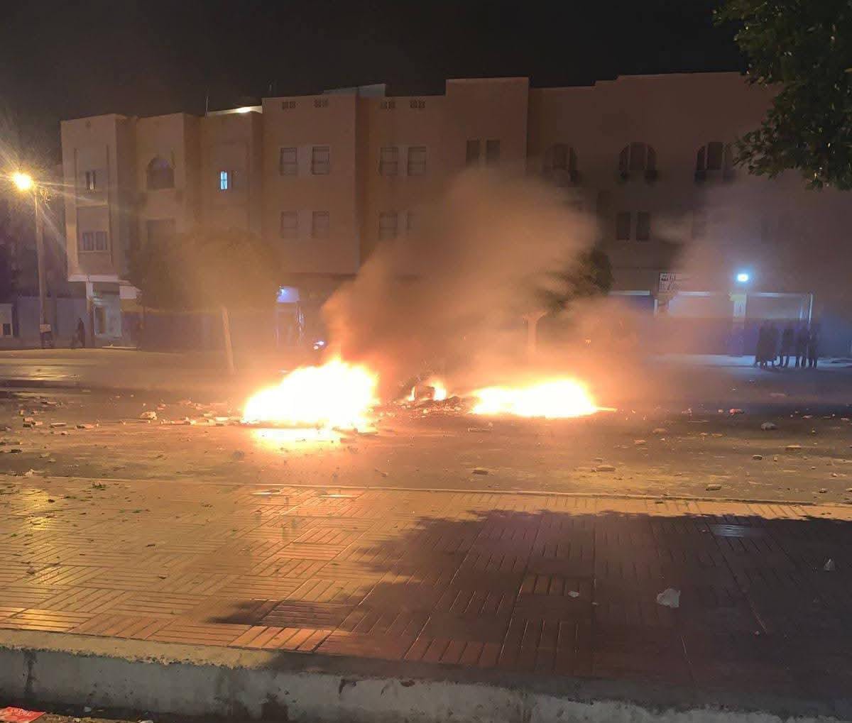 وخلفت هذه المواجهات، التي تواصلت إلى ما بعد منتصف الليل، إصابة عدد من عناصر القوات العمومية والسلطة المحلية، إضافة إلى إضرام النار في سيارة أمنية، وإحراق حاويات نفايات، وتخريب إشارات مرور وشبابيك بنكية وعربات خاصة بالمواطنين، فضلا عن قطع الكهرباء واقتلاع لوحات تشويرية بعدة شوارع.